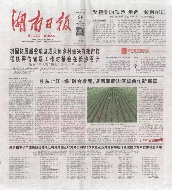 湖南日?qǐng)?bào)報(bào)道株洲學(xué)園印刷為湖南印刷行業(yè)2020一2021誠(chéng)信示范單位