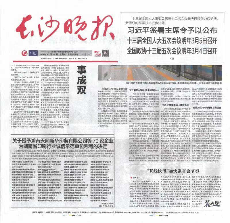 長沙日報報道株洲學(xué)園印刷為湖南印刷行業(yè)2020一2021誠信示范單位